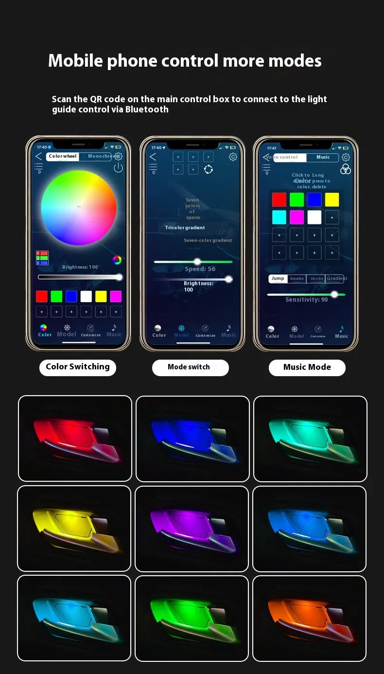 Transform your driving experience with this LED Car Atmosphere Light Strip, designed to create a vibrant, customizable lighting ambiance inside your vehicle. Featuring multiple color options and an easy-to-install design, this light strip enhances your car's interior, offering both style and functionality. Perfect for any vehicle, it includes foot lights, door handle lights, and an optional luminous horn buoy ring for a complete lighting setup.