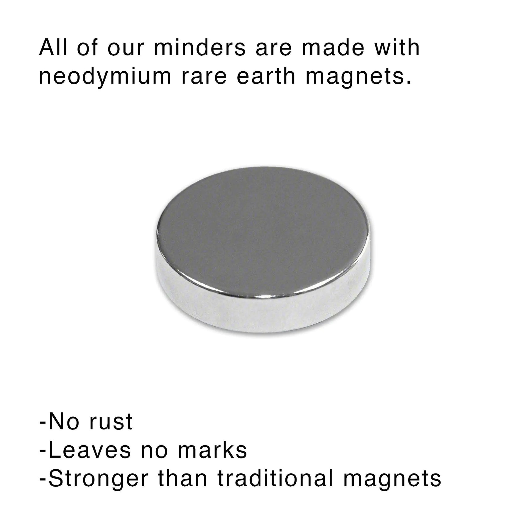 We use only neodymium rare earth magnets on our minders, which are much stronger than standard magnets and are guaranteed not to leave marks on your fabric.